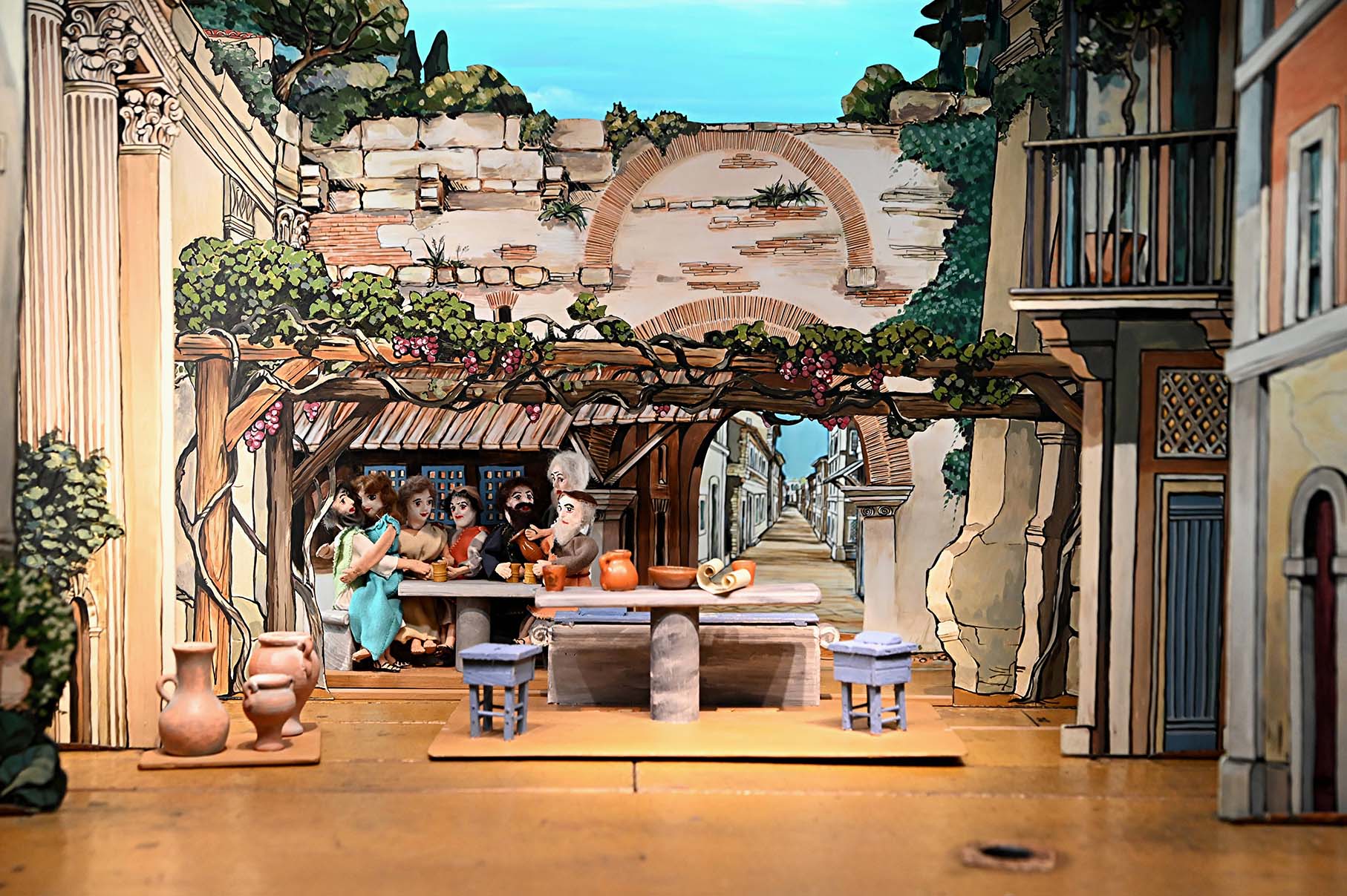 Die Bühne ist mit ihren Maßen von 80 cm Breite und 60 cm Höhe das Miniaturmodell einer barocken Gassenbühne; durch das Zusammenspiel aus der Kulissenanordnung und der gezielt eigesetzten Beleuchtung entsteht eine Illusion von Tiefe, die bei der Miniaturgröße überraschen mag. Das Baujahr der Bühne wird auf das frühe 19. Jahrhundert geschätzt und so vermag sie den Gästen ebenso wie den Spielern zu vermitteln, wie vor 200 Jahren Marionettentheater gespielt wurde und wie der Eindruck auf die Zuschauer gewesen sein muss.
